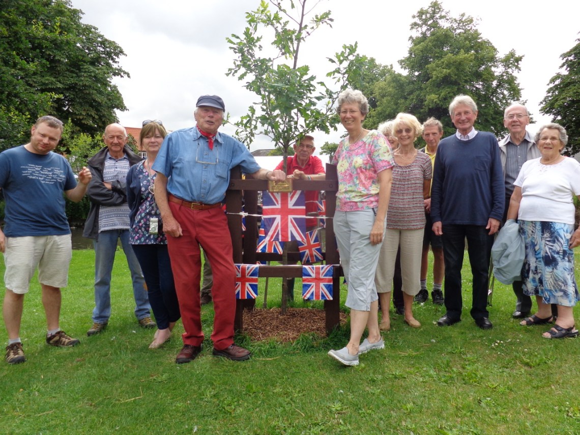Saturday 5 Jul 14: celebrating the planting of Alan Eade’s tree. Alan served on the Histon Parish Council for 25 years so we planted a tree on the Green in his honour. Alan’s on the left with Pene Nudds on the right and other members of the Parish Council and of the Village Society.
