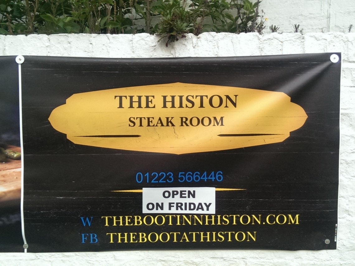 Tuesday 8 Jul 14: good news if the steaks are good. I’m still of the opinion that Histon & Impington needs a decent gastro-pub. A steak room isn’t quite the same but maybe it’s a step in the right direction. The landlady at the Boot (www.thebootinnhiston.com) is new and it would be nice to see this venture being successful