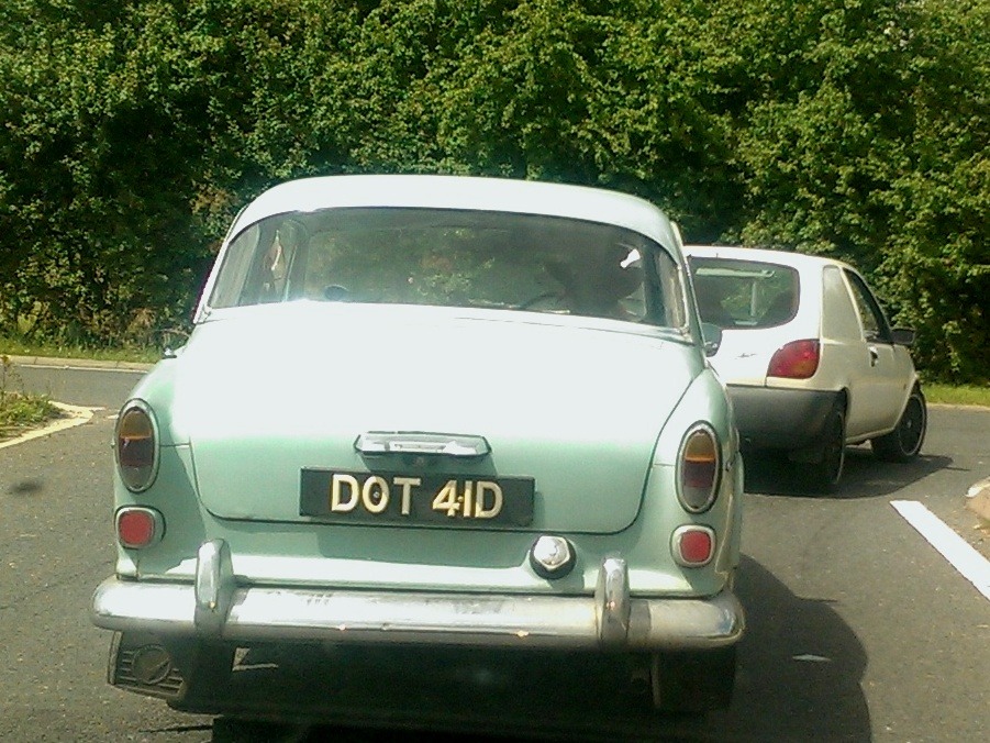 Thursday 18 Jul 14: straight out of the 60s. My second car ended in a G and that was late 60s so maybe this was 1965ish. Perfect pastel and the driver was wearing a fine hat.