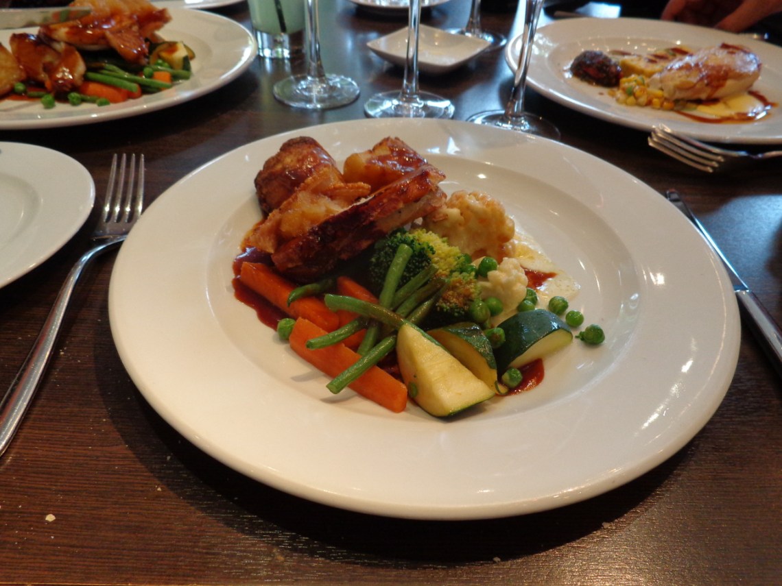 Sun 21 Sep 14 lunch @felixcambridge. Special lunch en famille because Charles is off to Australia later this month so this maybe the last time we’ll all have lunch together for a while. Perfectly good lunch, just disappointed by the long wait between main course and desert. Veggies with the roast pork (above) were super.