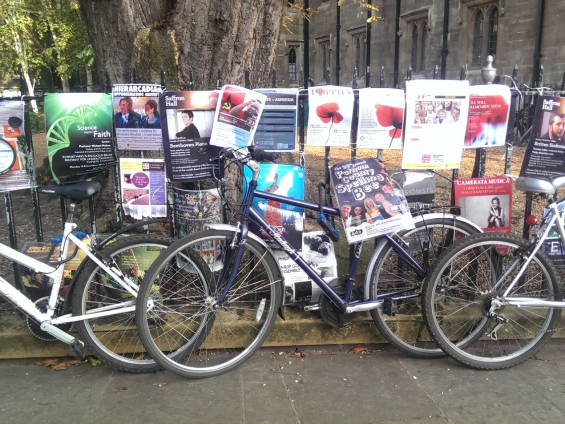 Thu 23 Oct 14: bikes and posters at All Saints Garden. Typical Cambridge shot and topical with the poppy posters.