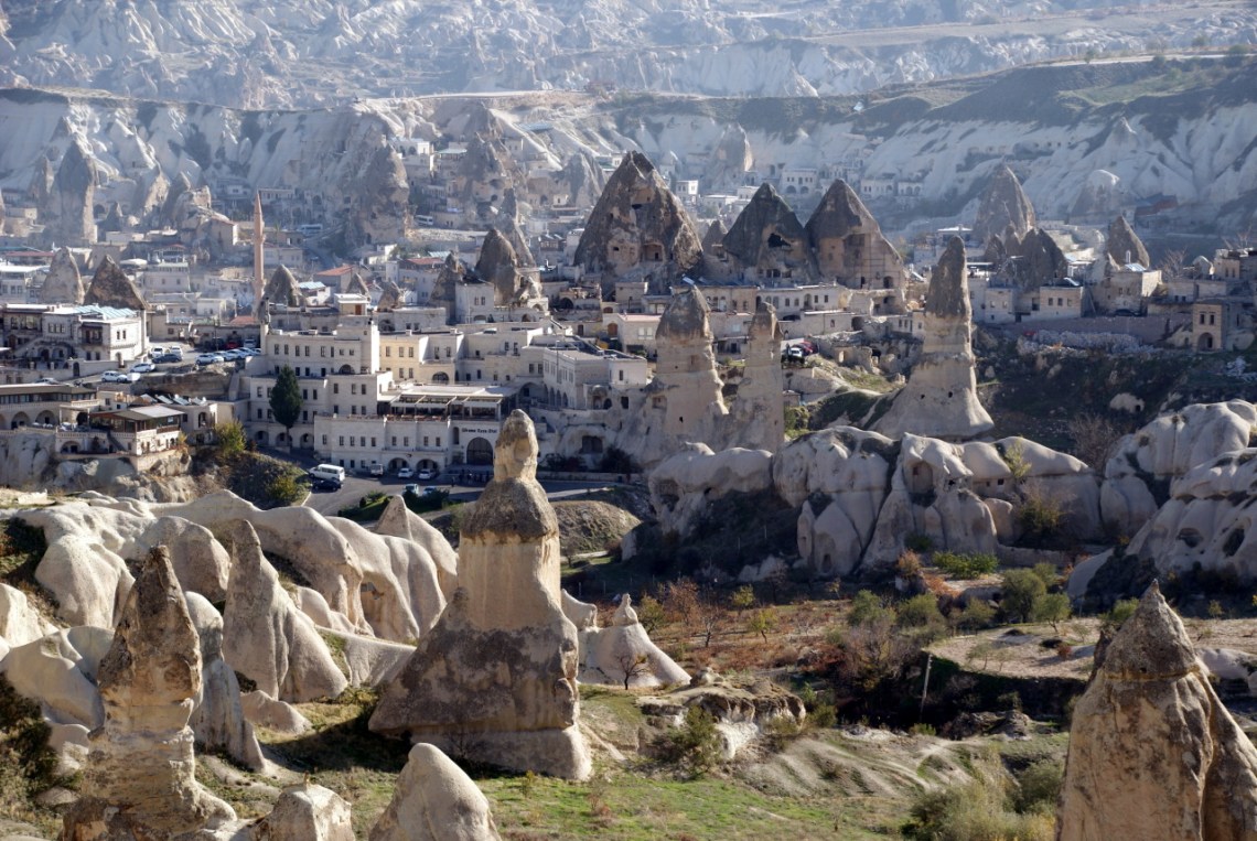 Sun 9 Nov 14: super view @GoremeInfo. Lots of examples of Cappadocia’s columns and capstones and the wonderful rock strata behind