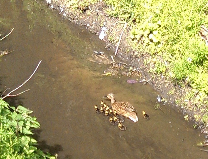 Mon 4 May 15: another sign of spring (and highlighting the deficiency of the camera in my phone; where’s my SLR when I need it?). A mother duck with a dozen chicks in the brook beside Park Lane in Histon