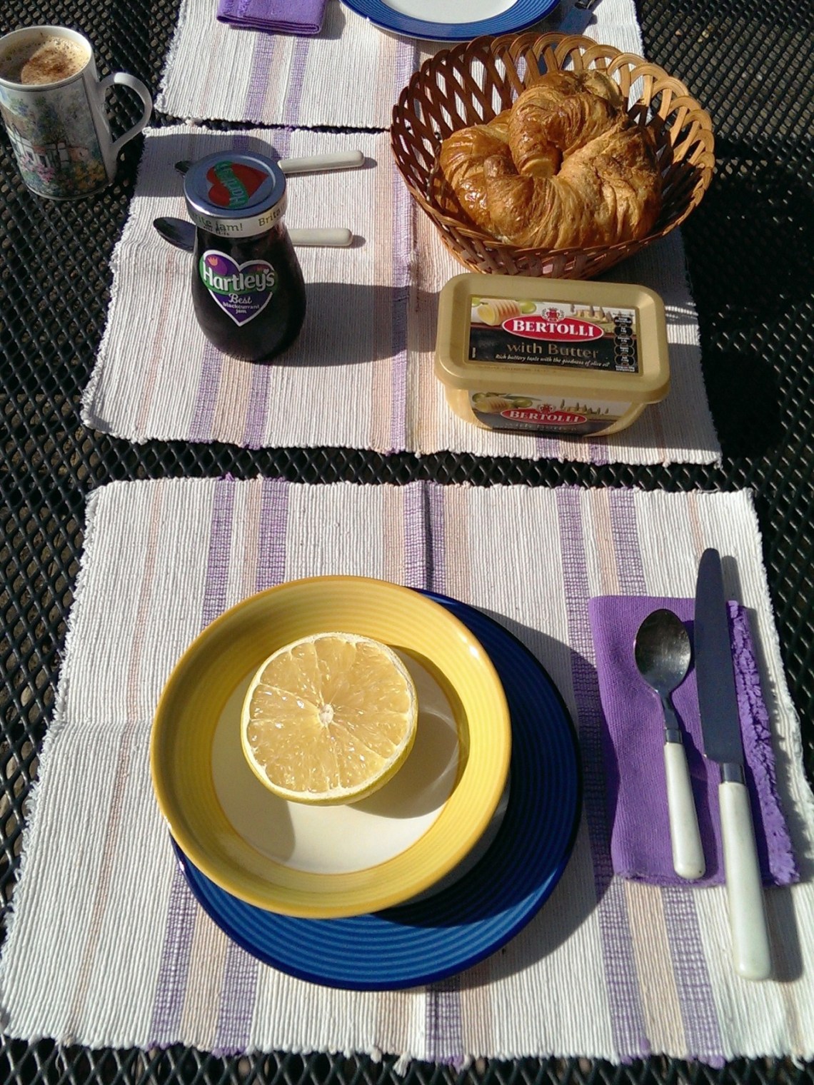 Sun 2 Aug 15: at last a Sunday for breakfast in the garden. Note the locally produced jam: Hartleys from the jam factory back of Vision Park.