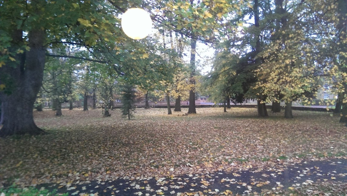 Tue 3 Nov 15: autumn trees out the front @impingtonvc. The hovering white disc is the reflection of the art deco light fitting inside meeting room 1!