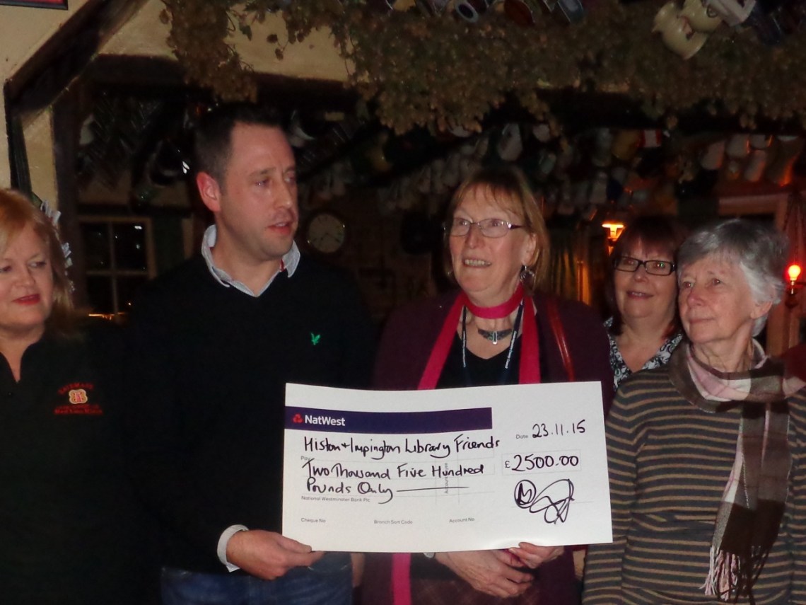 Mon 23 Nov 15: presenting a cheque from the Beer Festival to the Histon & Impington Library Friends @redlionhiston