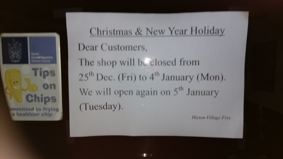 Tue 30 Dec 15: just when you’ve had enough seasonal food and want some plain old English fish and chips the excellent Histon Fryer takes a holiday! Can’t wait until next Tuesday.