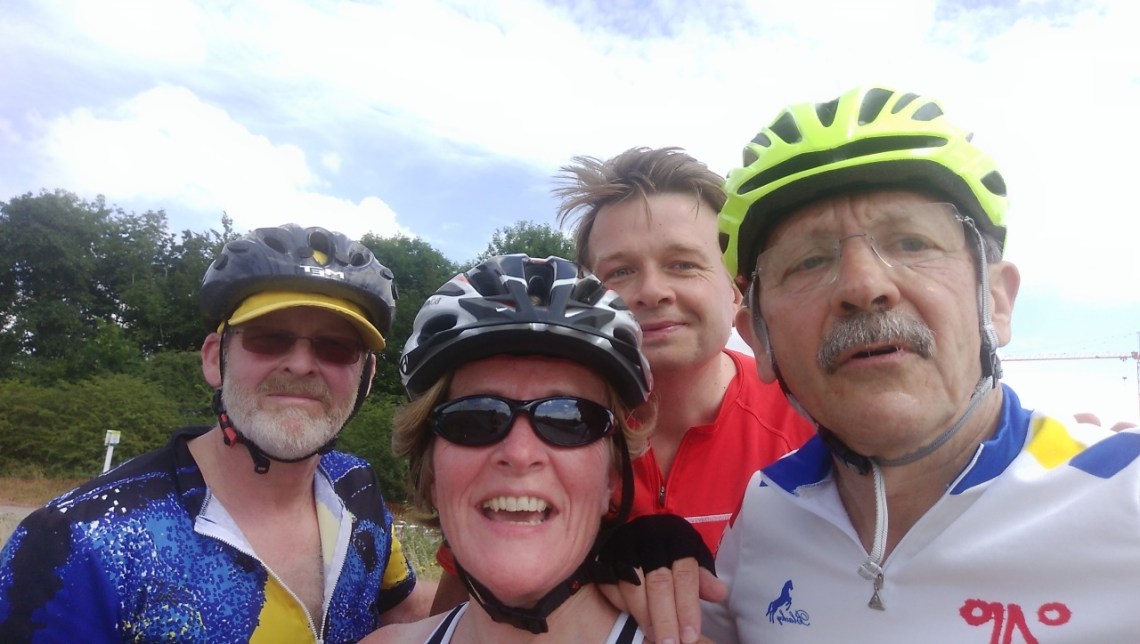 Sun 25 Jul 16: another HIBC photo just after I’d had an argument with a dropped kerb close to Addenbrooke’s (convenient). L to R: Al, Claire, Peter and me.