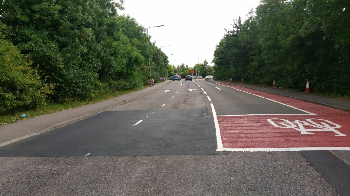 Tue 16 Aug 16: new lane markings on the B1049 southbound towards the A14 courtesy @cambscc. Looks like something which should have been done long ago.