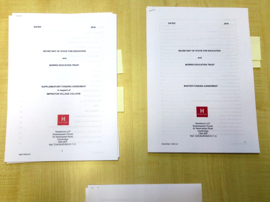 Wed 19 Oct 16: nearly there … more legal stuff to sign as we wet up the Morris Education Trust @impingtonvc. Wish we didn’t have to do it but it’s the only way to safeguard our school. Better this than a factory or a franchise MAT. Hope other independently minded VCs eg @cottenhamvc will join us.