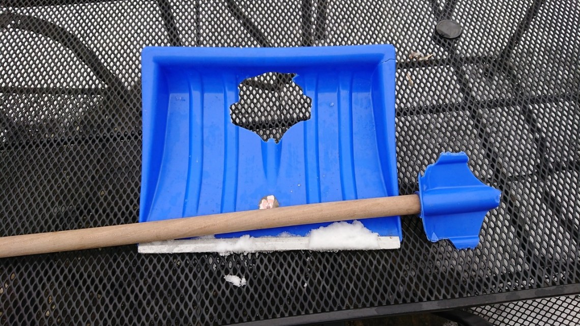 Sat 3 Mar 18: just shows how thermoplastics go brittle with age. I guess this is the shovel which we owned when we lived in Switzerland up until 1996 and haven’t used since.