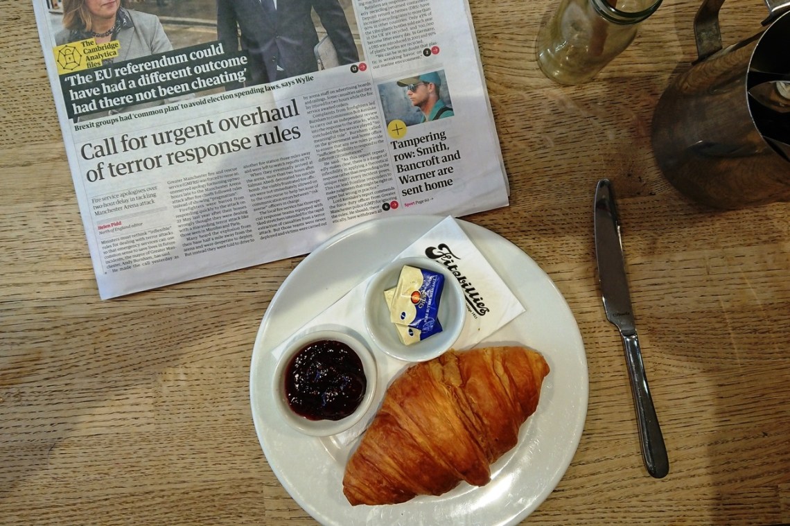 Wed 28 Mar 18: haven’t had a breakfast shot for some time … this is at Fitzbillies by Magdalene Bridge. There used to be a long bench table but it looks like Cambridge folk don’t like sharing so it’s now been sawn up into 4 individual tables.