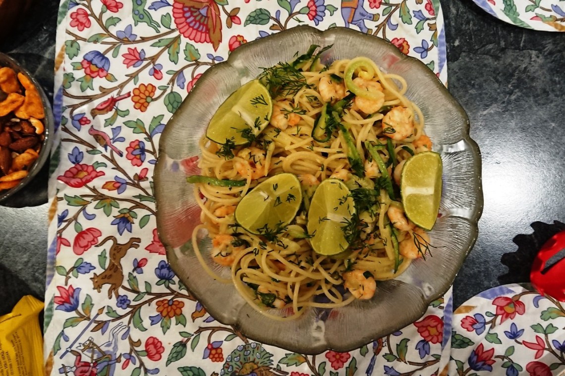 Sun 22 Apr 18: I was on chef duty last night. Spaghetti with prawns, courgettes, chilli and lime. Just right at the end of a super sunny day (with one torrential shower)