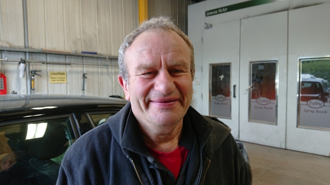 Mon 23 Apr 17: the excellent Barry Kempton who’s repaired my car where a stationary flatbed truck poked some piping into the side. Complicated little job which he labored long to do a great job and deliver against his quote.