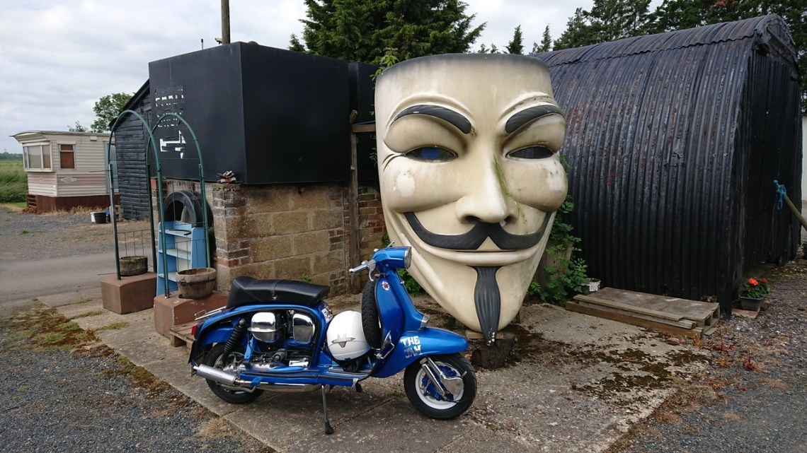 Fri 8 Jun 18: splendid anti-capitalist mask and equally splendid motor scooter at the excellent Hackers Fruit Farm just off the A14 at Dry Drayton.