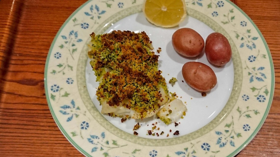 Sun 6 Jan 18: on chef duty again, Mrs J is under the weather. Herb crusted cod, methinks a little too much crust …