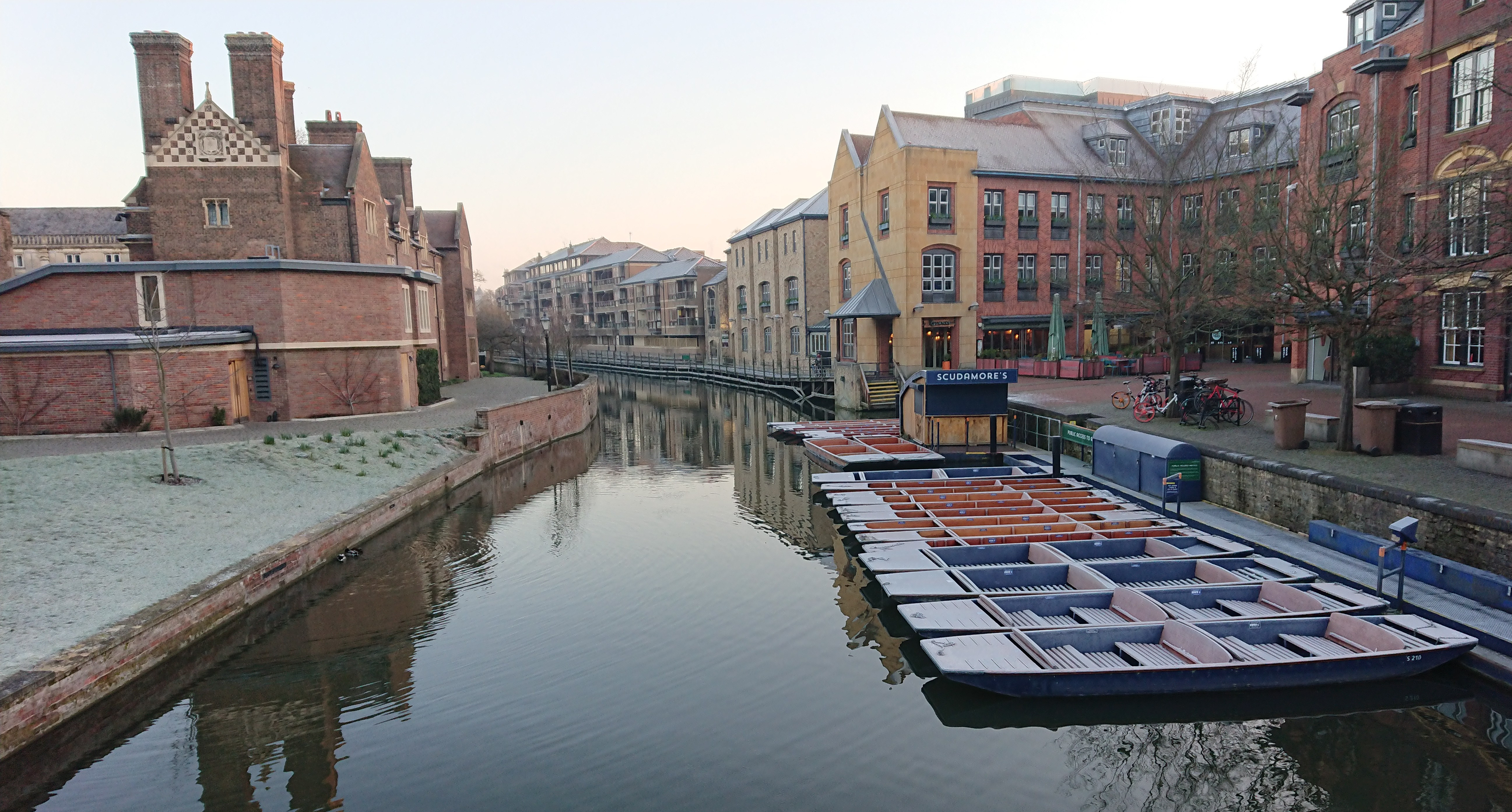 Thu 31 Jan 19: sparkling morning but the coldest night of the year. A cliche shot of punts on the Cam by Magdalene Bridge in Cambridge.