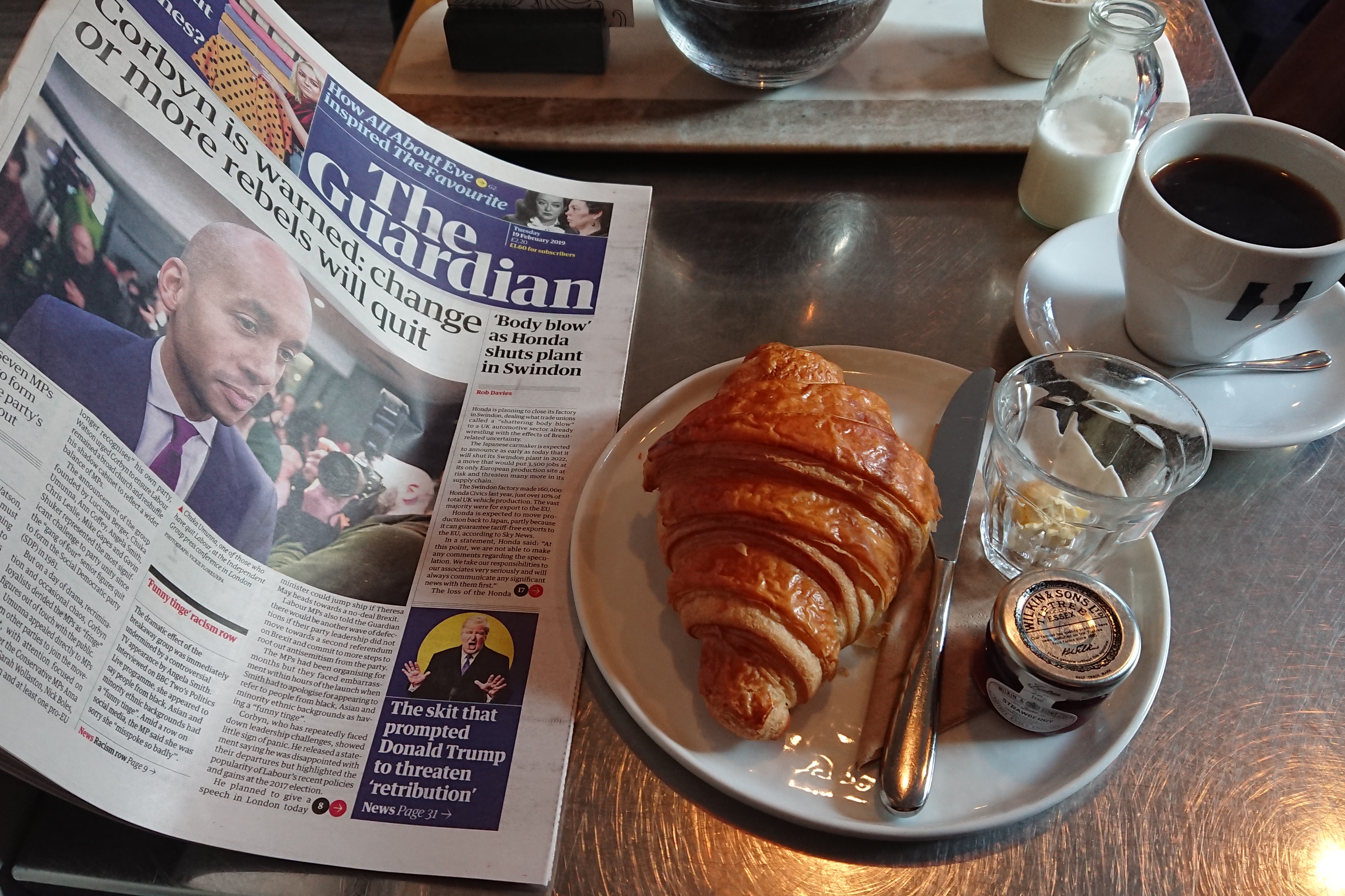 Tue 19 Feb 19: first time and a good experience with excellent croissants and service to my table upstairs! Sadly not really enough table room to read @guardian but I found a way to work round that.