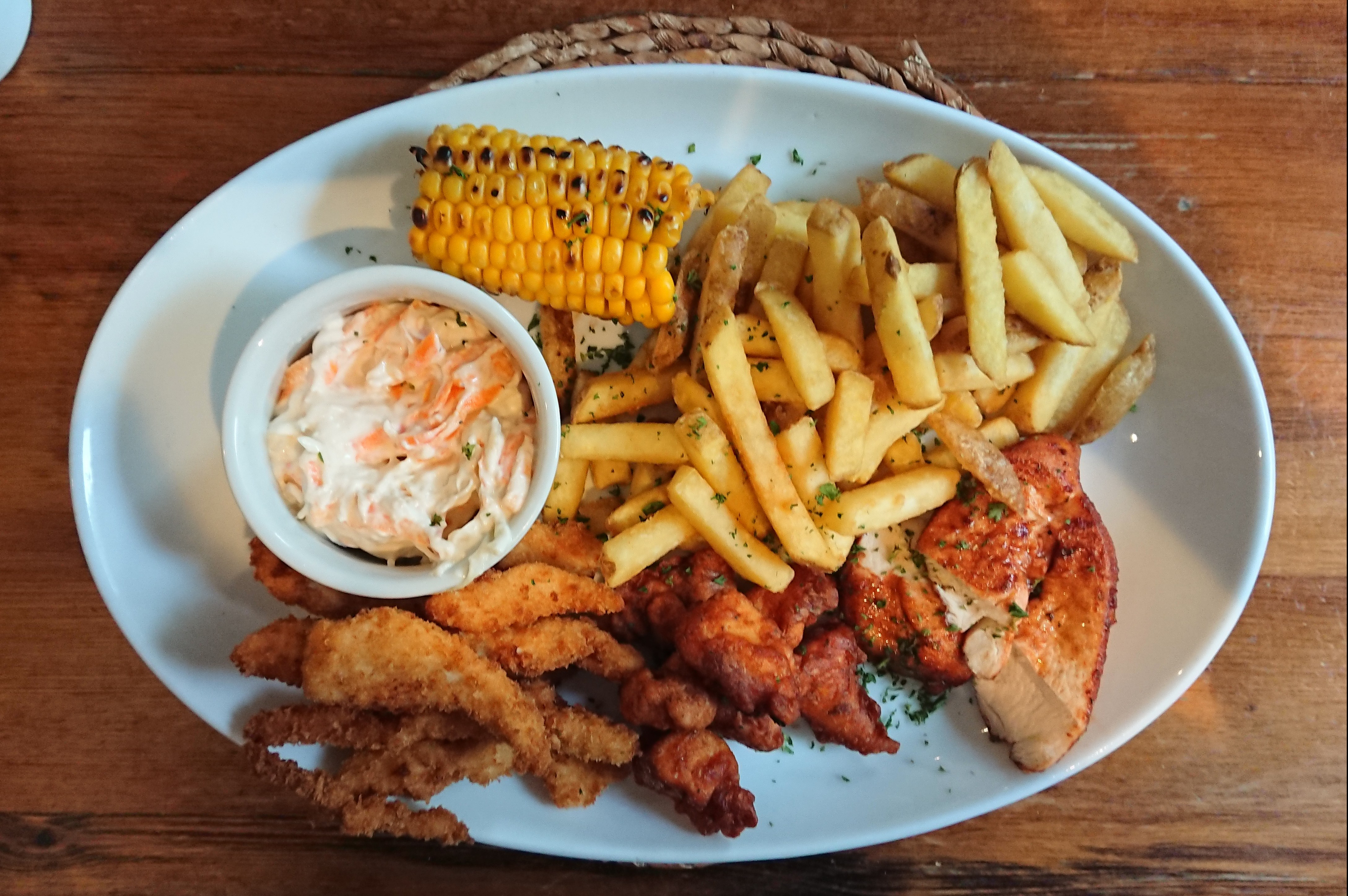 Wed 14 Aug 19: three kinds of chicken with cole slaw and sweet corn. Another example of the imagination shown by a local pub doing good pub food. Go there!