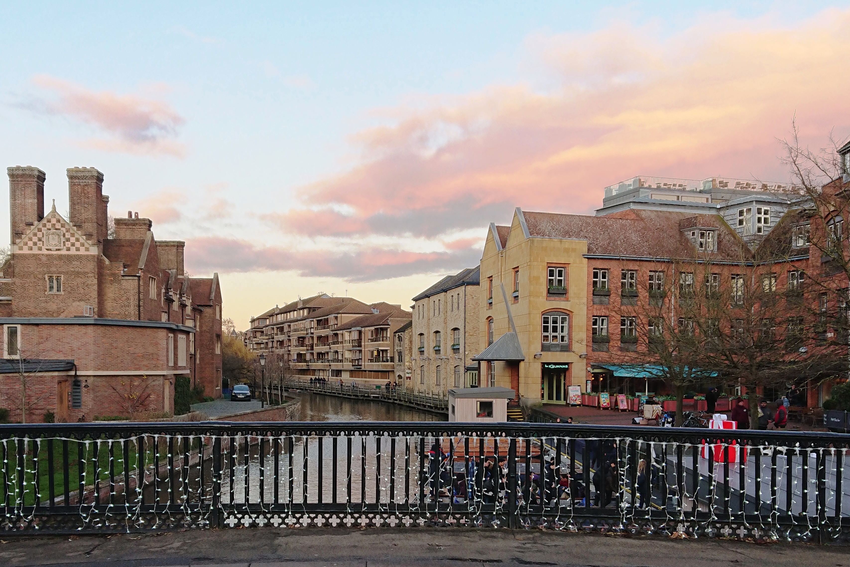 Sun 1 Dec 19: Magdalene Bridge looking east so it’s a bonus to get the colours in the sky. Note the lights on the bridge and the Xmas boxes on top of the Scudamore office.