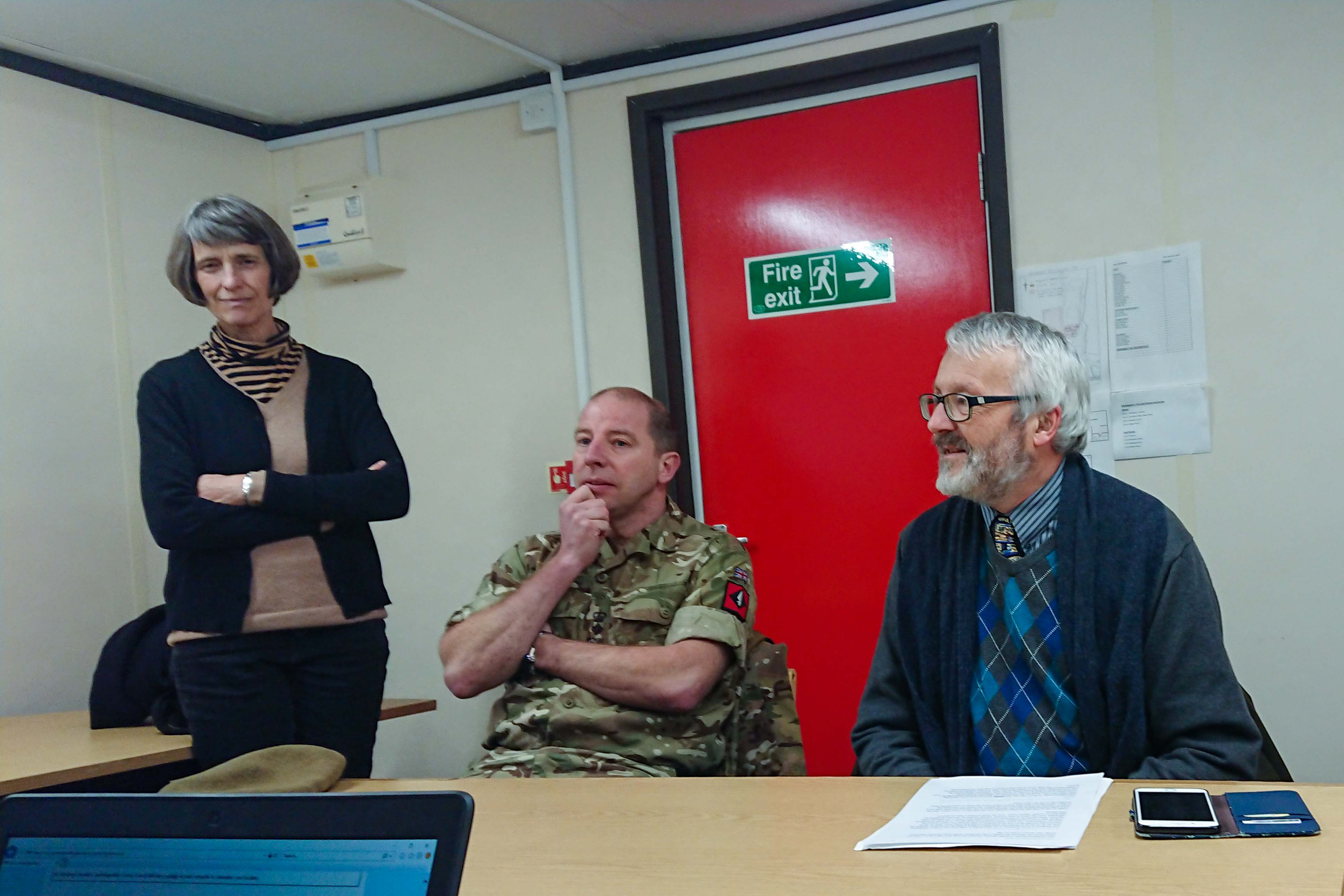 Mon 3 Feb 20: this is the end of the day for the Local Highways Initiative panel and the team from Whaddon is presenting. County Coincillor Susan van der Ven standing and military escort to her left.
