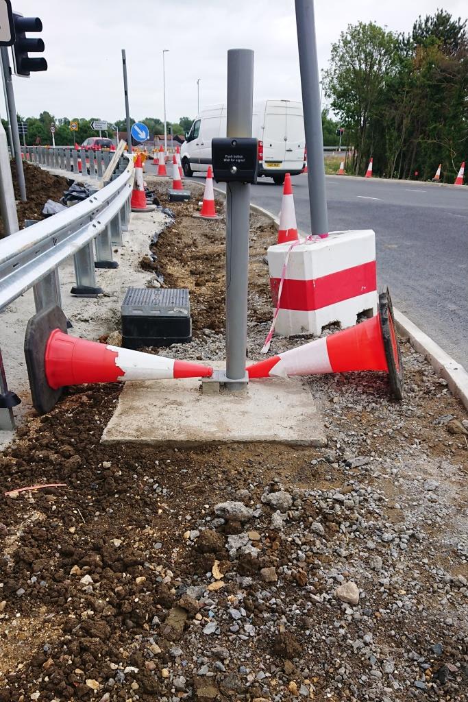 Mon 8 Jun 20: and that something is the needs of people other than motorised vehicle users. This is the NE quadrant of the A14/B1029 junction. Cyclists typically use it northbound. That’s where they meet what you see in the photo. First the need to make a sharp 90 degree turn and then the challenge of squeezing through the space on one side of the pole which you see. Sadly someone’s not thinking.