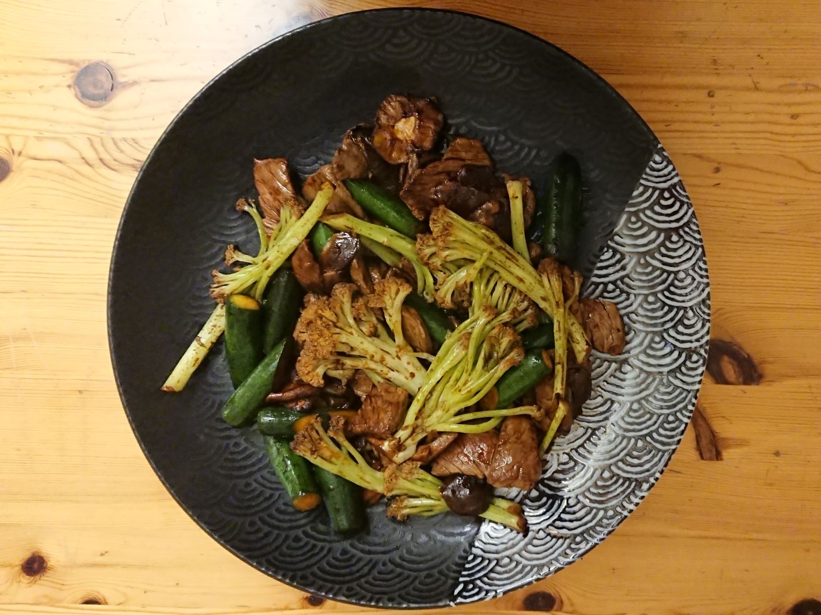 Tue 9 Feb 21: neither seen nor heard of sprouting cauliflower before but it works well in another classic Mrs J stir fry. This is beef with mini courgettes, mushrooms and the highlighted cauliflower.