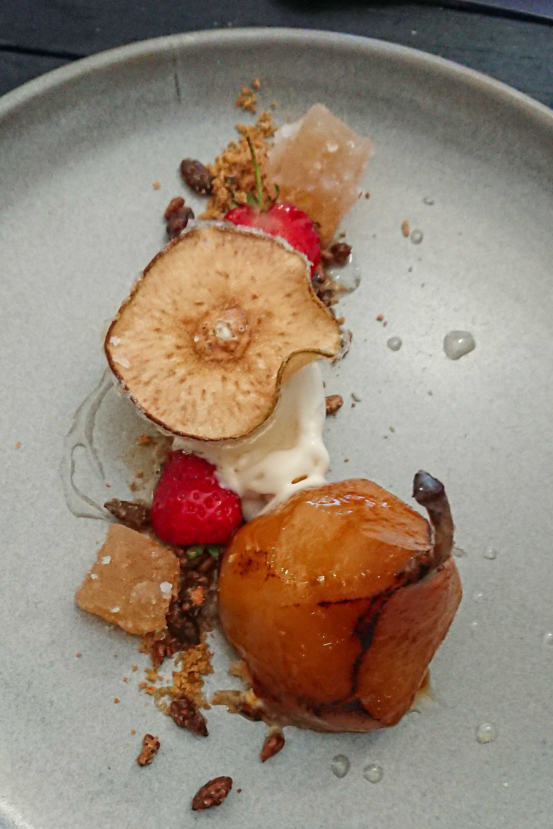 Wed 9 Jun 21: it was a smashing evening and we met Tony Halls for dinner. He ordered this pear desert.