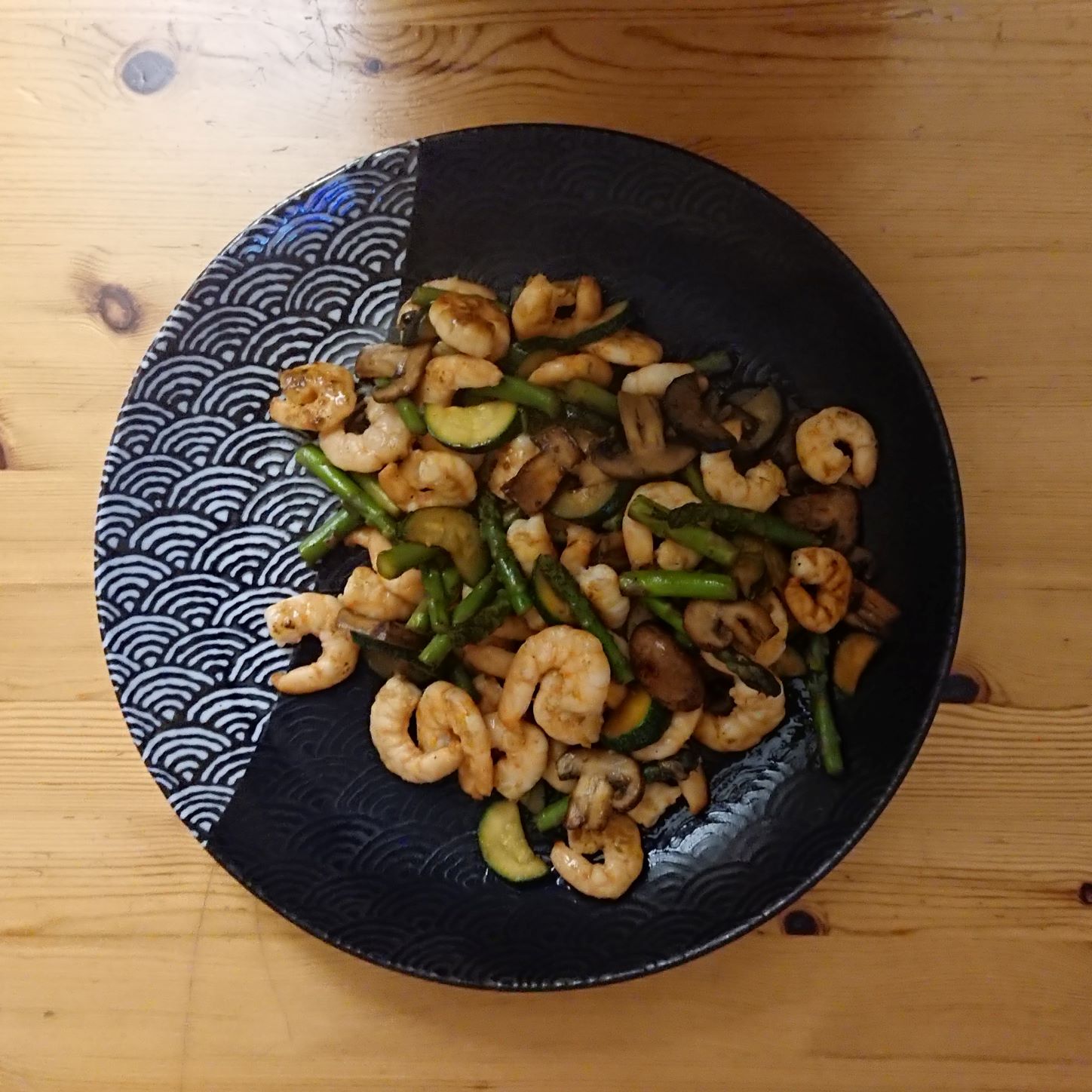 Tue 19 Oct 21: Prawns with courgette, asparagus and mushroom. All cooked al dente. Super tasty and just got to be healthy.
