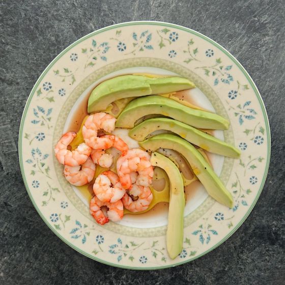 Tue 6 Apr 21: nice plate of avocado prawn from Mrs J. Beats the usual Co-Op ready meal!