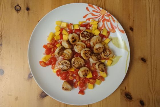 Wed 7 Oct 20: scallops with a classic Mrs J salsa. Maybe a little more chilli next time?
