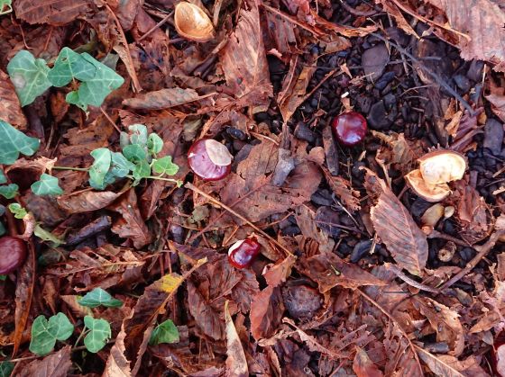Wed 23 Sep 20: Another autumn picture. Or should I say cliche? Conkers on the ground in Long Meadow.