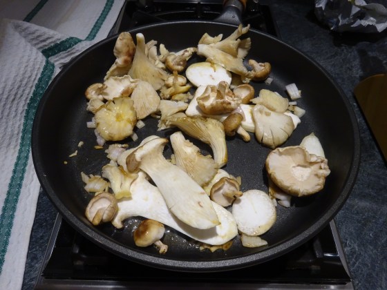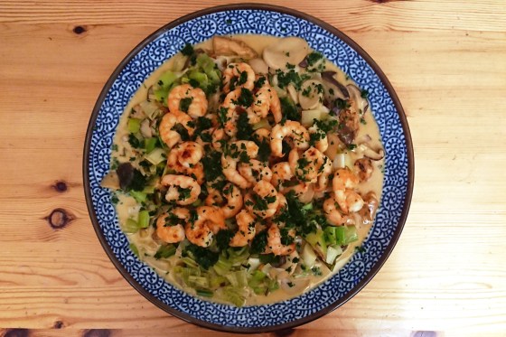 Tue 12 Mar 19: prawns with ‘exotic’ mushrooms and leeks. It was either this or a photo of the TV … More