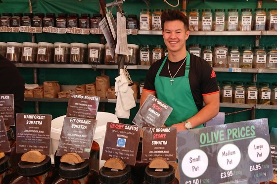 Sat 11 May 19: herbs, spices, coffee and tea, and olives. What more do you want? Stall’s at Cambridge market … More